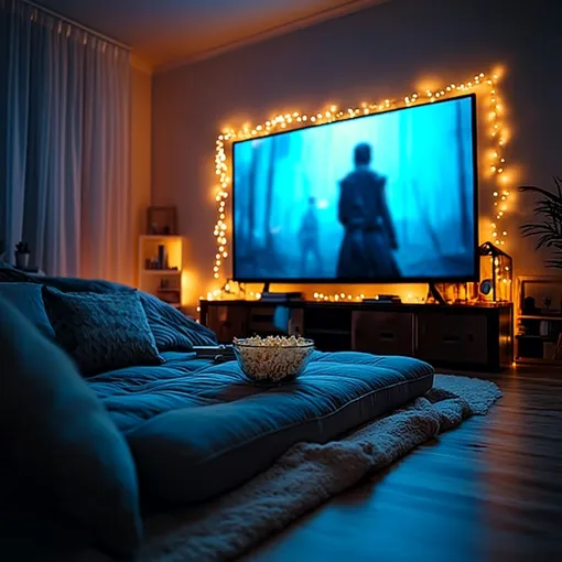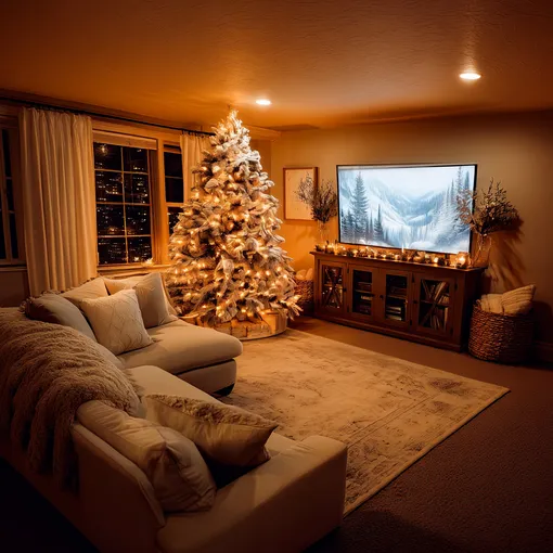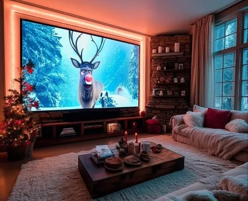 Приглушите основной свет — это создает эффект присутствия в настоящем кинозале. Идеально работают диммеры или светодиодные ленты с мягким светом. Можно зажечь свечи (только следите за безопасностью) или использовать арома-диффузор с хвойными или цитрусовыми маслами — это добавит новогоднего настроения. Позаботьтесь о температуре в комнате: лучше, чтобы было прохладно, тогда под пледом будет особенно уютно.