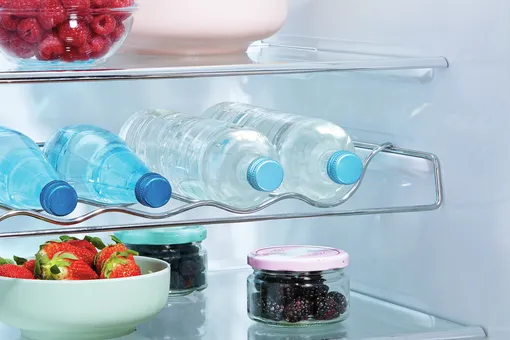 Специальная полка для бутылок и банок решает эту проблему раз и навсегда. Для каждой емкости предусмотрено собственное горизонтальное место, откуда она не соскользнет тебе под ноги, а содержимое не вытечет на дно холодильника.