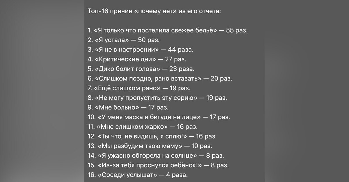 Наверно уже видели, что в тг вирусится картинка из серии «мем смешной, ситуация страшная». Какой-то мужик аж целый год вел список причин, по которым жена отказывала ему в близости.
