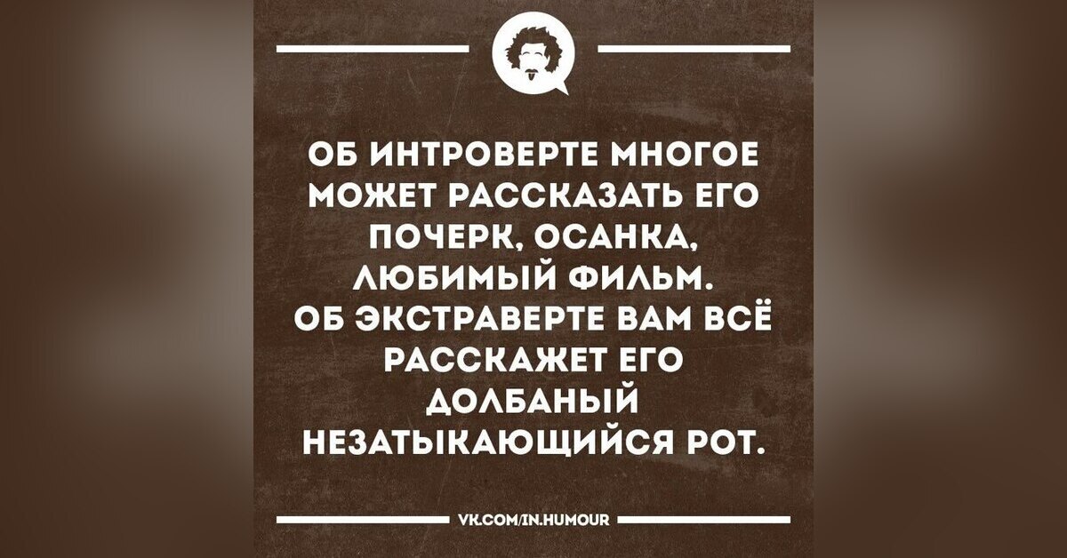 И представления об экстравертах какие-то дикие. Если человек любит общаться, это не значит, что он не устает от этого, и ему не нужно время в одиночестве, чтобы отдохнуть и восстановиться. И тем более экстраверт не будет общаться с кем попало просто ради того, чтобы двигать языком.