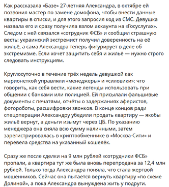 Ей советуют агентство (оно, само собой, в доле), агентство быстренько находит покупателя (и он тоже), тот приобретает квартиру за три копейки. (Напомню, Лурье заплатила в два раза меньше, чем стоила квартира Долиной на рынке.) Бабушку потом убеждают положить деньги на специальный счет или отдать «сотруднику ФСБ» как доказательство.