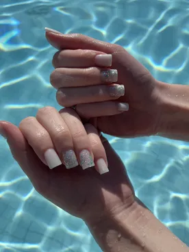 Мой выбор остановился на маникюре молочно-голубого оттенка в сочетании с бирюзовыми блёстками, переливающимися на солнце точно так же, как вода в бассейне или морская рябь. Этот дизайн переносит в атмосферу отдыха, беззаботности и лёгкого морского бриза.