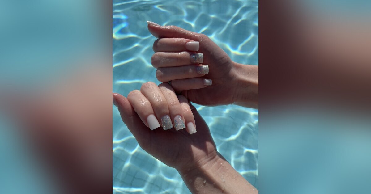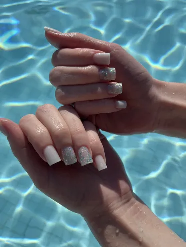 Мой выбор остановился на маникюре молочно-голубого оттенка в сочетании с бирюзовыми блёстками, переливающимися на солнце точно так же, как вода в бассейне или морская рябь. Этот дизайн переносит в атмосферу отдыха, беззаботности и лёгкого морского бриза.