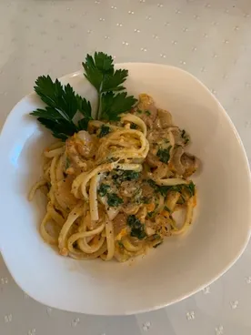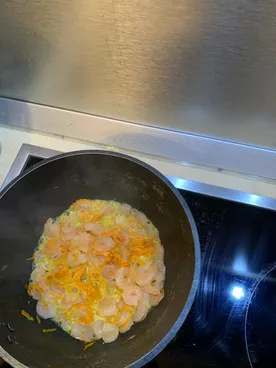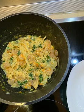 Барилла # 13, отварить 10 минут, откинуть, обжарить в смеси оливк.(для жарки) и сливочного масла тертую морковку и пару шампиньонов, туда же полпачки (или целую 500 гр., будет 3-4 порции) коктейльной креветки, сухой чеснок, через 1 мин тертый сыр (пармезан и моцарелла) думаю, можно любой, какой есть, сливки, (у меня концентрированное молоко в ж/б), вернуть пасту, добавить петрушку, перец черный молотый, соль (у меня розовая с травами) на все 15-20 мин с подачей. Готовила сегодня, специально для конкурса)