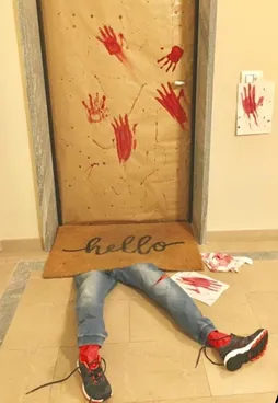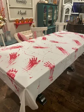 Это вешала в ванной вместо шторы. Бинты и гуашь.