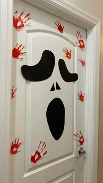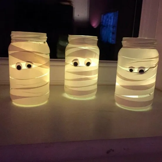 Тут всё просто: мышей вырезаем из черного картона, приведения — шарик из фольги и марля. В идеале марлю лучше смочить в растворе крахмала и высушить на бутылке, чтобы держала форму. Глаза рисуем маркером.