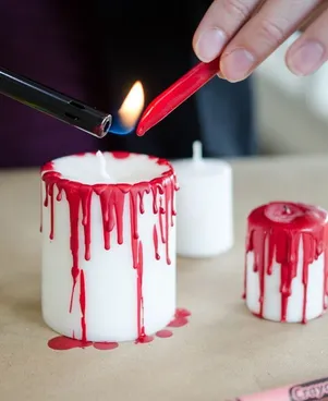 Не совсем поняла, что тут плавят: я просто поливала белые и черные свечи растопленной красной свечой.