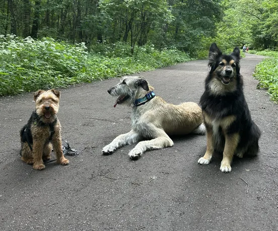 Обращаю внимание, что оставшиеся позади обсуждающие — это очень пожилая женщина в кресле-каталке и ее, скорее всего, дочь. Улыбаются, продолжают обсуждение и пытаются нас догнать. Я замедлилась на случай, если они чего-то от меня хотят. А они и правда: «Извините, пожалуйста, а можно кого-то из ваших собак погладить?»