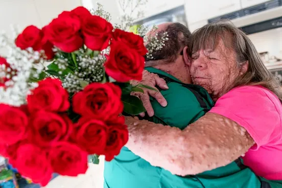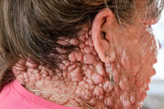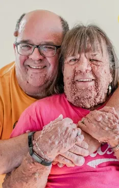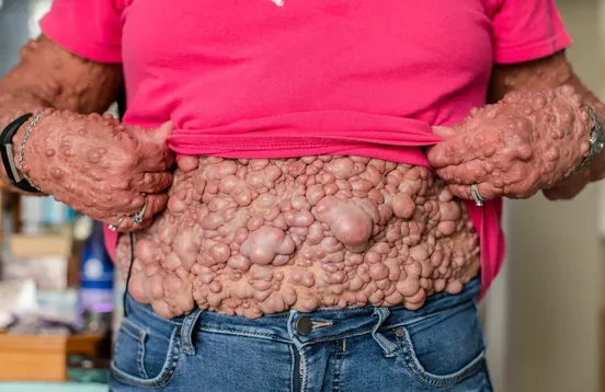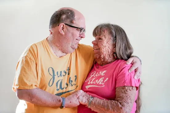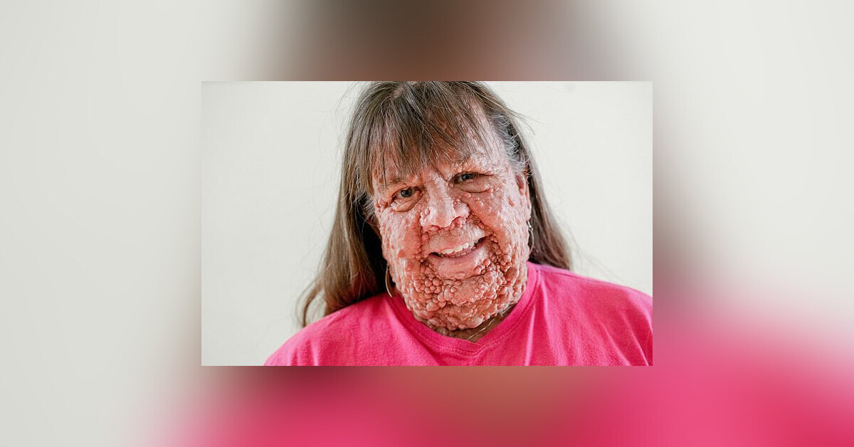 Это Гейл Аппельгрен, ей сейчас 63 года, и она страдает от нейрофиброматоза I типа — генетического заболевания, при котором на теле образуется множество доброкачественных опухолевых узелков. За свою жизнь Гейл прошла через 40 операций, и всё равно 90% ее кожи покрыта «пузырьками».