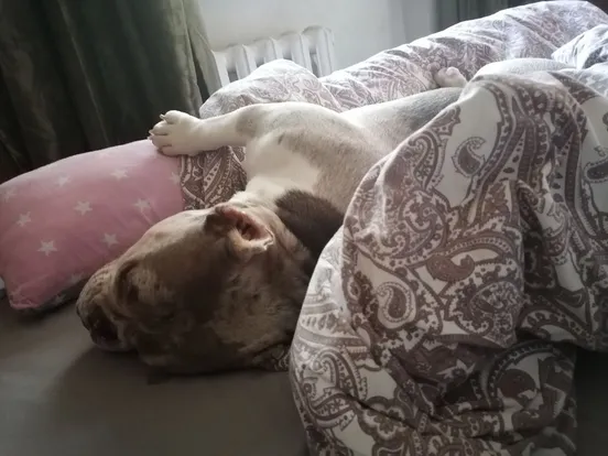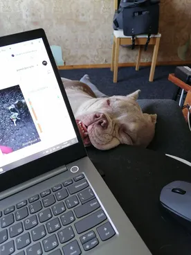 Меня предупреждали, что щенок спит 16 часов в сутки, но никто почему-то не сказал, что остальные восемь часов пятимесячный булли захочет проводить со мной. Сейчас Василисе год, и мало что изменилось: всё свое свободное от сна время она хочет взаимодействовать ну хоть как-нибудь: играть, деликатно жевать руку или хотя бы лежать у меня на ногах. (Делать это она научилась, даже когда я готовлю.)