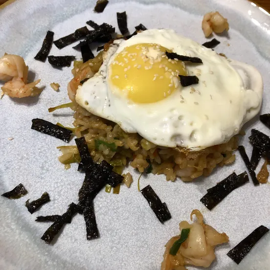 Жарим! Разогреваем растительное масло, кидаем порей и капусту, жарим минут 5, добавляем рис, жарим, добавляем рассол от кимчи, соевый соус и кунжутное масло, пробуем, если надо добавляем еще. Подаём с глазуньей. На самом деле, я больше люблю сделать так: готовый рис сдвинуть в сторону, а на освободившейся стороне сковородки жарю яйца типа скрэмбла, а потом все перемешиваю, но в оригинальном рецепте положено яйцо класть сверху. Дальше посыпаем кунжутом и нарезанным чипсами из нори. Если любите поострее, то в процессе приготовления добавьте пасту кочудян, это такая красная коробочка. Я реально дольше рецепт писала.