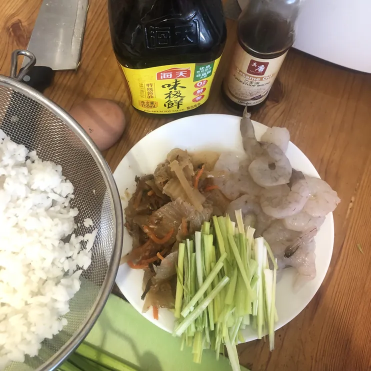 Нарезаем соломкой лук, кимчи крупными кусками. Я не знаю в каком виде она продается в пакетиках, нарезанная или нет, у меня четверть-кочанами, так что нарезаю ножницами, чтобы не пачкать доску, а то кимчи — штука «ароматная». Креветки я люблю нарезать вдоль или на мелкие кусочки, если надо «размазать» мало креветок на много еды, но можно и целиком. Зеленый лук нарезать крупно.