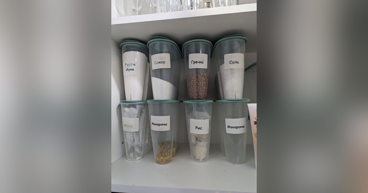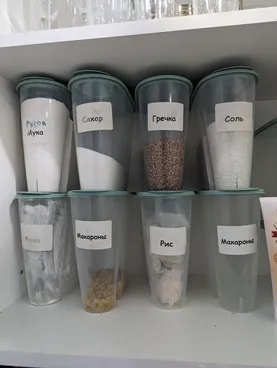 1) Организация хранения вещей: взять — положить в 3 касания. Например, открыть дверцу шкафа, взять подписанный контейнер с сахаром и затем вернуть его на место — 3 касания. Часто вижу, что крупы хранятся у людей в разномастных непрозрачных коробках без подписи. Удобнее, когда видишь свои запасы. То же касается одежды. Бесконечные стопки проигрывают любому прозрачному контейнеру с вертикальным хранением.