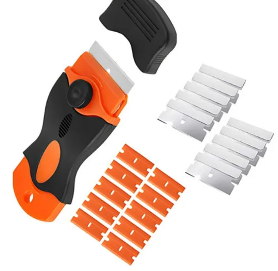 Никакие средства не помогали убрать этот налет. А вот скребок на раз два все оттер! И плитка не поцарапалась. Я заметила это пытаясь отлепить наклейки от полок.
