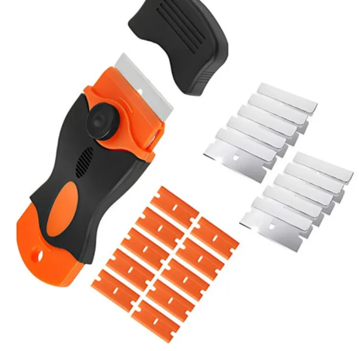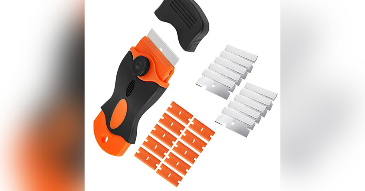 Никакие средства не помогали убрать этот налет. А вот скребок на раз два все оттер! И плитка не поцарапалась. Я заметила это пытаясь отлепить наклейки от полок.