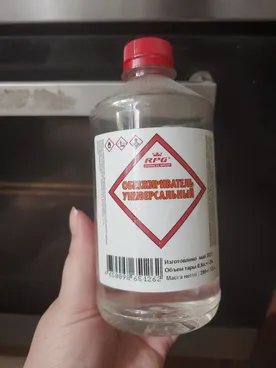 Сразу хочу заметить, что действовать будет не на всех поверхностях, так как средство это химическое и может снять краску или сделать поверхность мутной. Обезжириватель быстро испаряется, поэтому эффективно будет использовать средства понемногу. Также когда им что-то протираете нужно не торопиться и позволят растворителю вступать в реакцию с жиром на поверхности. И главный минус это резкий химический запах.