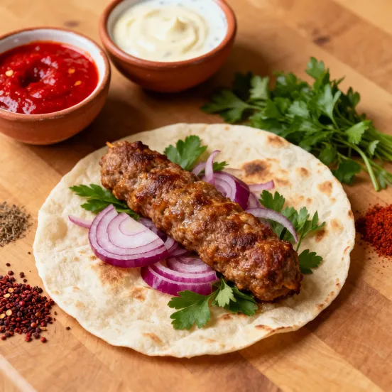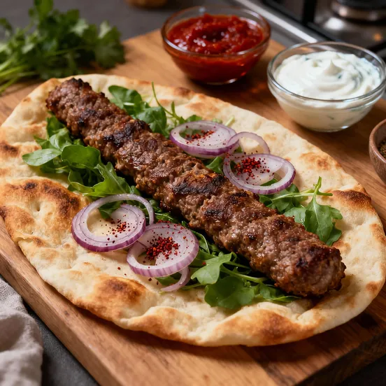 Подавайте горячие люля-кебаб на лаваше, украсив их свежей зеленью и красным луком, аджикой и чесночным соусом.