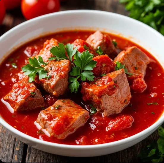 Нарезать телятину на куски, обжарить на сковороде до золотистой корочки. Добавить нарезанный лук и чеснок, жарить до мягкости. Влить помидоры, добавить специи, тушить на медленном огне 30-40 минут.