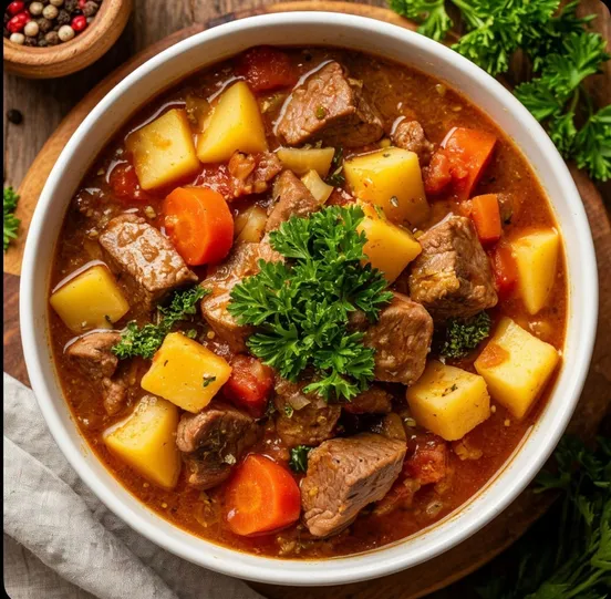 Добавить нарезанный картофель, влить бульон, посолить и поперчить. Тушить на медленном огне 1-1,5 часа до готовности мяса.
