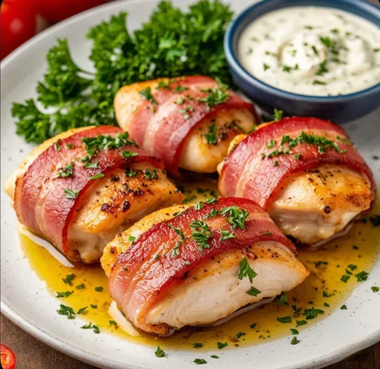 Обернуть куриные грудки беконом, закрепить зубочистками. Запекать в духовке при 180°C 25-30 минут.