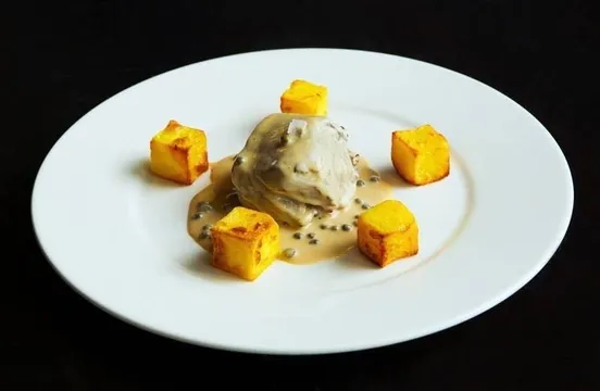 Вырезку выложить на тарелку, полить тёплым соусом. Подать с обжаренным кубиками картофеля.