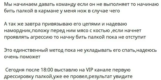 «Продолжаем бить и вводить собаку в стресс, а без камеры необходимо ударить четыре раза по голове арматурой и продолжать этот метод в течении 8 месяцев, только так получим нужный результат».