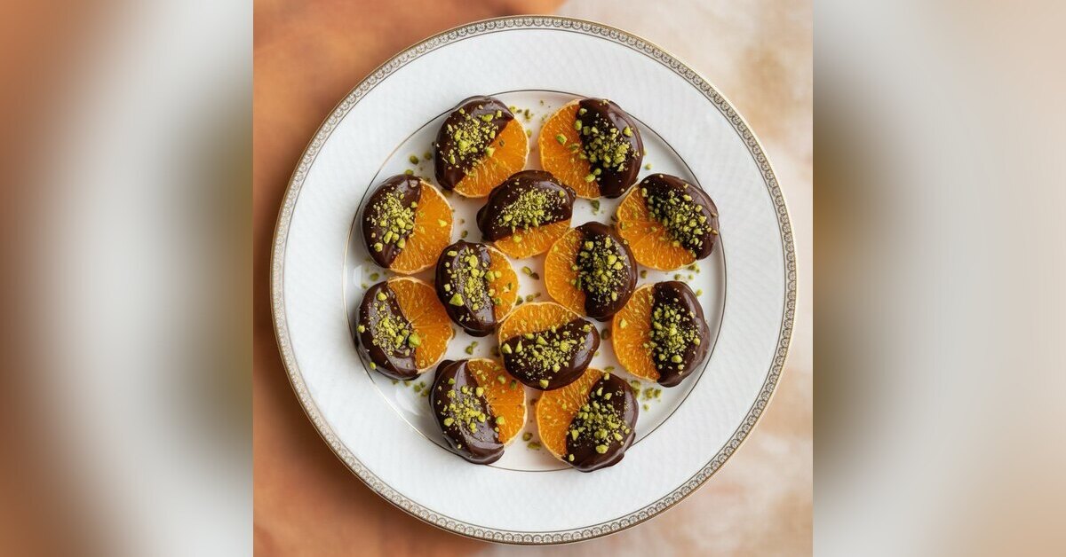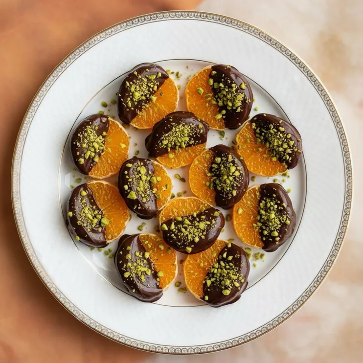 Окуните каждую дольку мандарина в растопленный шоколад, позволяя излишкам стекать. Обваляйте шоколадные дольки в толченых фисташках, пока шоколад еще не застыл.