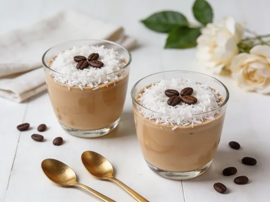 Перед подачей посыпьте панакоту кокосовой стружкой и украсьте кофейными зернами.