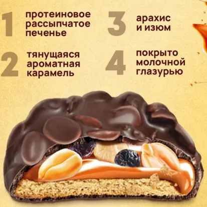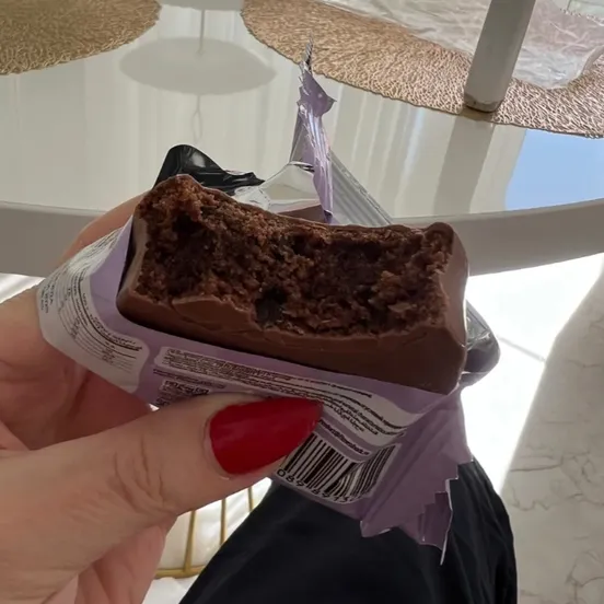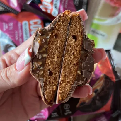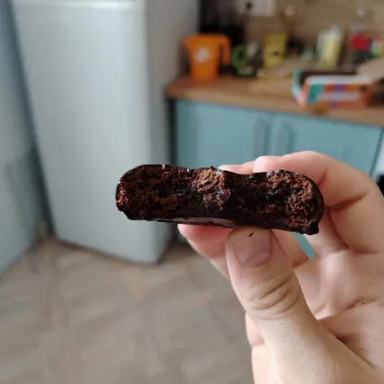 Одно из недавних — и неудачных — приобретений. Выглядит эффектно — я ожидала влажного брауни с насыщенным шоколадным вкусом, но получила заурядное протеиновое печенье: мелкодисперсная структура, ярко выраженный вкус протеина, неудачная глазурь и тонюсенькая фруктовая прослойка — совсем не как на фото. Кбжу тоже так себе — белка мало, углеводов и калорий — много.