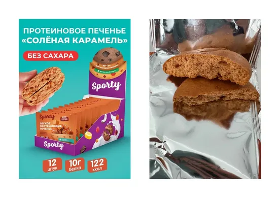 Тут тоже нет глазури, что позволяет брать печенье с собой в жару и не думать о том, во что оно превратится. По текстуре мягкое, от обычного бисквитного отличается, но не сильно, умеренно сладкое. Вкус протеина ощущается, но не критичен. Мои любимые вкусы — тоффи и соленая карамель (с крошечными кусочками ириса и карамели соответственно). Недавно появился глазированный вариант, но его я еще не пробовала.