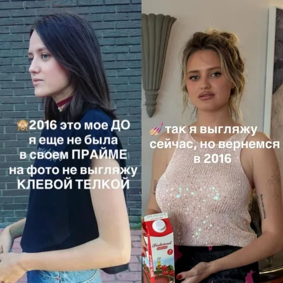 Тут недавно был тренд на воспоминаия о 2016 и принесли мне соцсети интересный пост. Одна блогерша вовсе не ностальгировала по Пикникам Афиши и Парижу/Берлину на выходных, как все, а вспоминала, какой она была тогда уродкой, некрасивой, не в своей прайме и стеснялась своей внешки. Ну а сейчас конечно в прайме. Что изменилось?