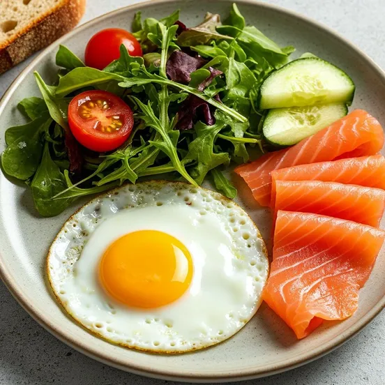 Выложите зелень на тарелку, добавьте кружки огурца и половинки помидоров черри и лосось рядом с зеленью. В сковороде жарьте яйцо «глазунья»: аккуратно разбейте яйцо, посолите и поперчите по вкусу, жарьте до желаемой степени прожарки белка и текучести желтка, переложите в тарелку .