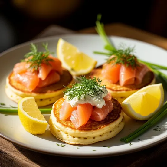 Ложкой выкладывайте тесто на сковороду, формируя оладушки. Жарьте с обеих сторон до золотистой корочки. Готовые оладушки выложите на тарелку. На каждую порцию положите ломтик слабосолёного лосося, добавьте немного творожного сыра, украсьте укропом и подавайте с дольками лимона.