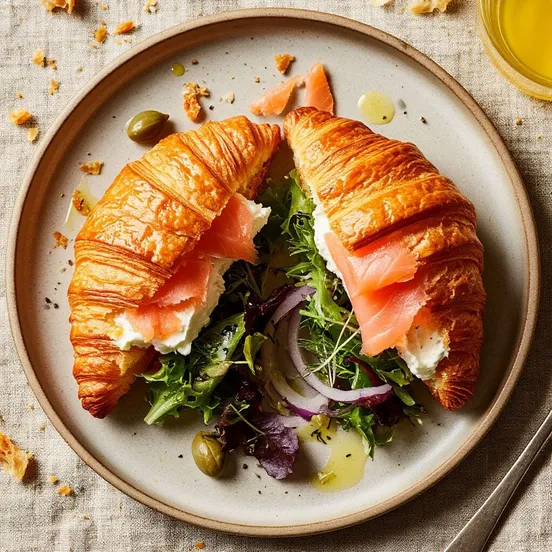 Разогрейте духовку до 180–190°C. Разрежьте каждый круассан вдоль пополам и подогрейте в духовке 2-3 минуты. На нижнюю половину каждого круассана нанесите равномерно сливочный сыр. Выложите ломтики копчёного лосося поверх сыра. Добавьте слои зелени и тонко нарезанный красный лук. По желанию посыпьте каперсы для пикантности. Полейте салат оливковым маслом и лимонным соком. Поперчите и слегка посолите по вкусу. Накройте верхними половинками круассанов и слегка надавите, чтобы начинки зафиксировались.