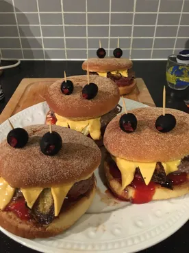 Вообще шикарно — всего-то надо покромсать край сыра и воткнуть две оливки в бургер. Бургеры вообще можно заказать готовые, чтобы не возиться.