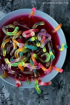 Оказывается, достаточно замочить мармеладных червяков в гранатовом соке, чтобы они смотрелись отвратительно. До этого видела только, как их втыкают в раскрошенный бисквит — типа вылазят из земли.